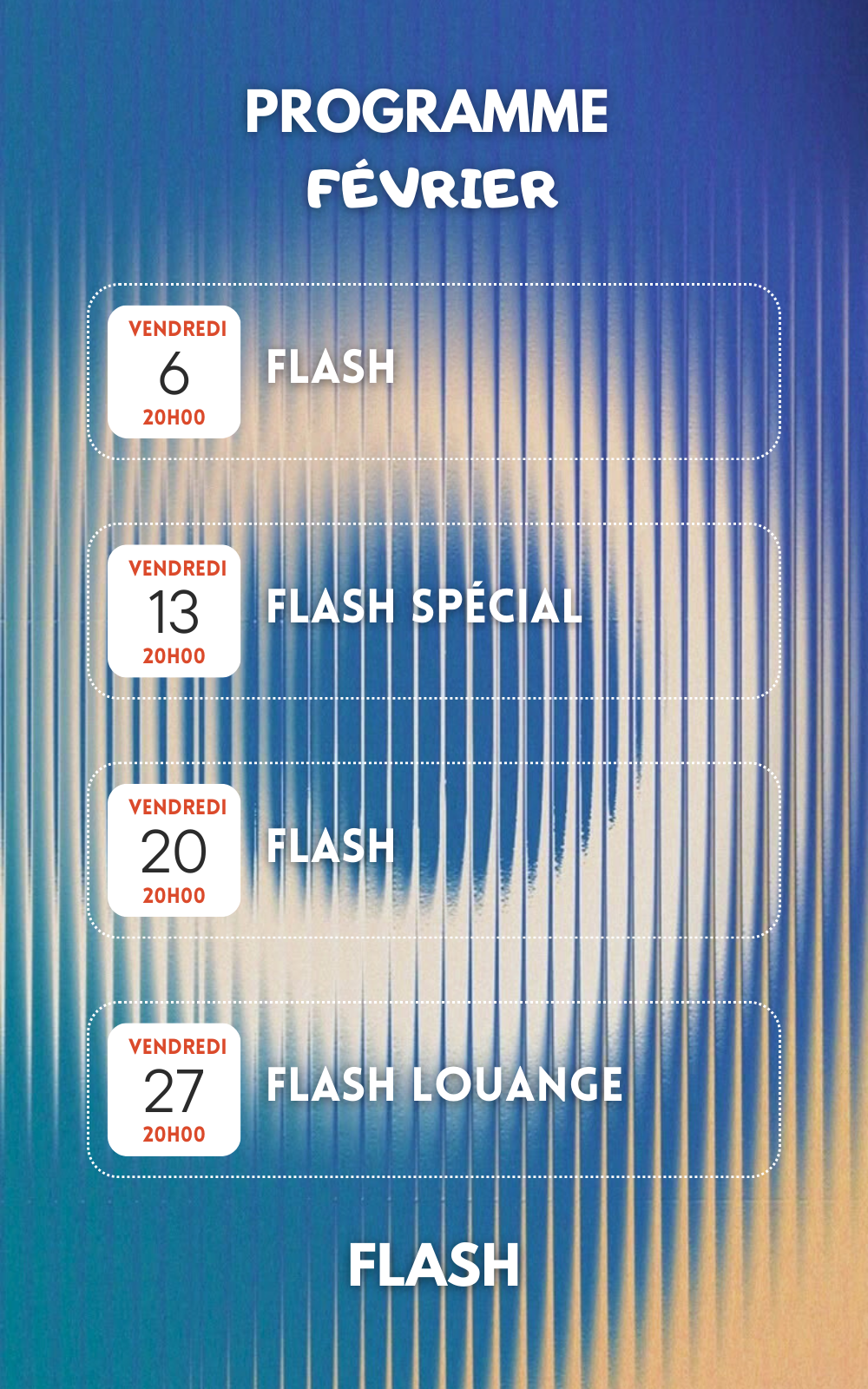 Le Flash est un groupe de jeunes qui se réunit tous les vendredis soirs au Centre Chrétien de Porrentruy. Au fil des semaines, tu découvriras Dieu au travers de soirées variées tels que des soirées de partages, de témoignages, de louange, de prière et de jeux. Tu rencontreras également d’autres jeunes qui partagent le même monde et les mêmes défis que toi.